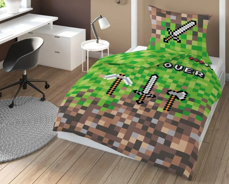 Bawełniana pościel dla dzieci i młodzieży z motywem grafiki pikselowej w kolorach Minecrafta. Komplet poszwa na kołdrę + poszewka na poduszkę z grafiką 3D Pixel Art opartą na kolorystyce bloków trawy, kamienia oraz ziemi, czyli podstawowych bloków z gry Minecraft. Dodatkowo na poszewce i poszwie umieszczone artefakty gracza w postaci mieczyka, kilofa i siekiery. Dwustronne pościele dla dzieci i nastolatków z rozmytymi pikselami w zielono-brązowej kolorystyce z szarymi akcentami. Komplet pościeli Minecraft 3D o wymiarach poszwy na kołdrę 140x200, 135x200, 140x180, 140x160, 120x180 lub 120x160 i 100x160 z jedną powłoczką 50x60, 50x70, 50x80 lub 60x70 i 70x80 cm w komplecie w zależności od wybranego wariantu rozmiaru. Dostępne również inne wymiary niestandardowe. Pikselowa pościel Minecrafta Game Over z motywem przestrzennym wykonana ze 100% bawełny, certyfikowana zgodnie z Oeko-Tex 100 z materiałów bezpiecznych dla dzieci, powłoczki zapinane na zamek. Pościel z kolorowymi pikselami z gry Minecraft to świetny pomysł na upominek dla graczy tworzących konstrukcje i budowle w trybie kreatywnym oraz niezbędne wyposażenie pokoju fana gry. Możliwe warianty kompletów: poszwy na kołdry 100/160, 120/160, 120/180, 140/160, 140/180, 135/200, 140/200 i powłoki na poduszki: 40/60, 50/60, 50/70, 50/75, 50/80, 60/70 oraz 70/80 cm. Producent Detexpol, model Pościel Minecraft pixel art 3D 3866, ean 5901685682473 (140/200), 5901685682466 (160/200)