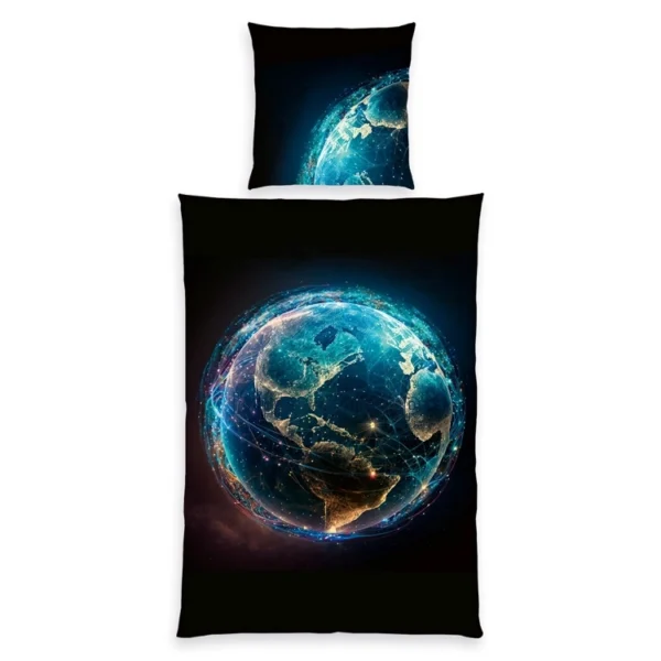 Komplet pościeli dla starszych dzieci i nastolatków z nadrealistycznym motywem kuli ziemskiej widzianej z orbity kosmicznej z rozświetlonymi punktami oplecionymi siecią połączeń.