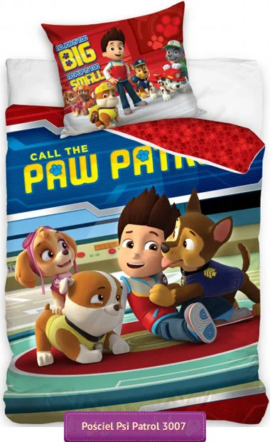 Pościel Psi Patrol Chase z bohaterskimi psiakami z miasteczka Adventure Buy. Pościel z bohaterami serialu Paw Patrol wyświetlanego na kanale Nickelodeon o przygodach Ryder-a i jego drużyny pomocnych i bohaterskich piesków. Licencyjne komplety pościeli Paw Patrol z wizerunkiem Ryder-a, Chase-a, Rubble, i Skye na poszwie na kołdrę oraz wszystkimi szczeniakami na poszewce na poduszkę. Rewers pościeli w czerwonej kolorystyce i znakiem charakterystycznym w postaci odciśniętych psich łapek. Komplet pościel Psi Patrol 160x200, 140x200 cm a także Pościel Psi Patrol 150x200 (rozmiar Ikea) lub 135x200 (rozmiar Jysk) w zależności od wybranej opcji z jedną powłoczką na poduszkę 70x80 cm. Komplet pościeli Psi Patrol Chase zapinany na suwaki, wyprodukowany na licencji Nickelodeon, z bawełny 100%, certyfikowany zgodnie z Oeko-Tex standard 100 wykonany z materiałów bezpiecznych dla skóry dziecka. Producent Carbotex, model Pościel Psi Patrol Ryder & Chase PAW 163007, ean 5902689401985 (160/200)