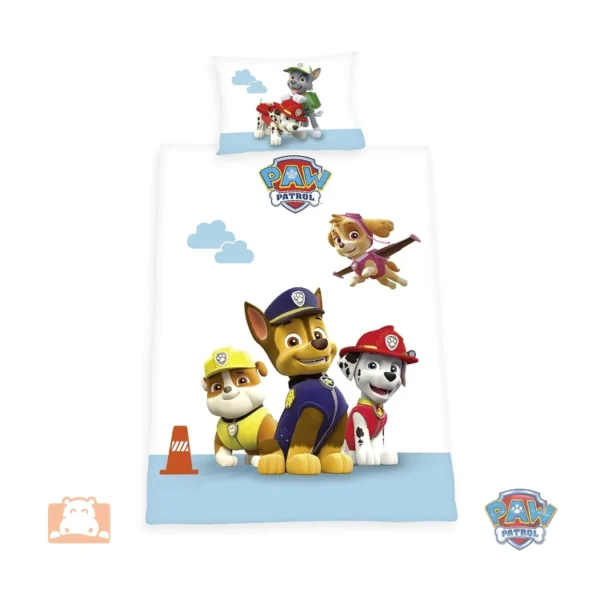 Komplet pościeli dla maluchów i starszaków do małego łóżka dziecięcego z postaciami drużyny Psiego Patrolu, z serialu dla dzieci o szczeniakach niosących pomoc w każdej niebezpiecznej sytuacji.