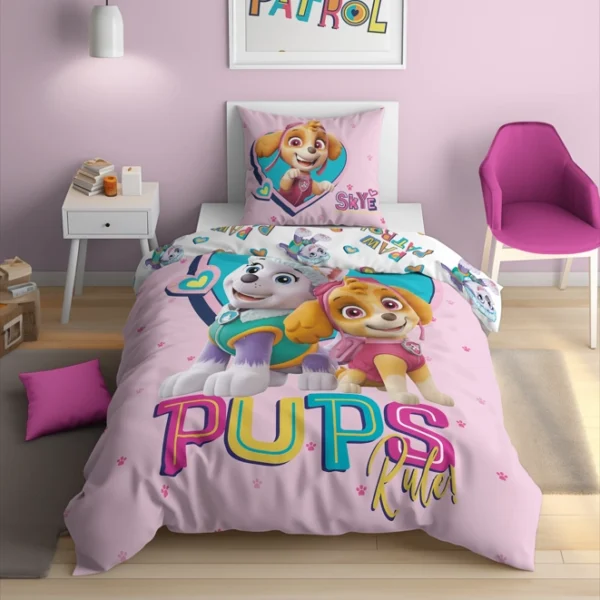 Różowy komplet pościeli ze szczeniakami Skye i Everest Psi Patrol PP 30, 100% bawełna, Oeko-Tex 100, na suwaki, rozmiary: 150x200, 160x200, 140x200, 135x200 oraz 120x160, 120x180, 140x160 i 140x180 cm