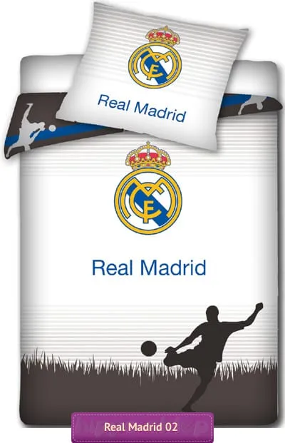 Pościel Real Madrid 02 oryginalny licencyjny komplet pościeli z klubowym logo Realu Madryt w rozmiarze poszwy na kołdrę 140x200 cm lub 160x200 cm oraz poszewki na poduszkę 70x80 cm. Pościel Real Madryt wyprodukowana ze 100% bawełny gładkiej, zapinana na suwaki, posiada certyfikat oryginalności (hologram) oraz certyfikat Oeko-tex 100 gwarantujący wykonanie z materiałów wysokiej jakości bezpiecznych dla skóry dziecka. Pościel z Realu Madryt to doskonały pomysł na prezent dla młodych kibiców klubu, Cristiano Ronaldo i pozostałych piłkarzy Królewskich z Madrytu. Producent licencyjna pościel piłkarska Carbotex, model Pościel Real Madryt RM 2010