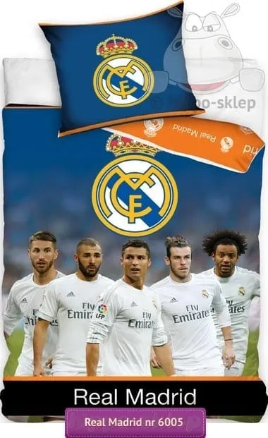 Pościel Real Madrid Ronaldo komplet pościeli dla kibiców Realu z postaciami największych gwiazd zespołu: Cristiano Ronaldo, Sergio Ramos, Luka Modric, Gareth Bale, Marcelo. Pościel Ronaldo dostępna w rozmiarze poszwy 140x200 cm lub 160x200 cm a także 150x200 oraz 135x200 i poszewki 70x80 cm, tkanina 100% bawełna gładka, zapinany na suwak. Pościel z Ronaldo jest certyfikowana w/g normy Oeko-tex 100 gwarantującej wykonanie z materiałów bezpiecznych dla skóry dziecka. Pościel z wizerunkiem piłkarzy klubu Real Madryt wyprodukowana na licencji, posiada hologram potwierdzający oryginalność. Pościel z Realu Madrid to doskonały pomysł na prezent dla fana Cristiano Ronaldo i Królewskich. Producent piłkarska pościel licencyjna Carbotex, model Pościel Real Madryt RM 6005