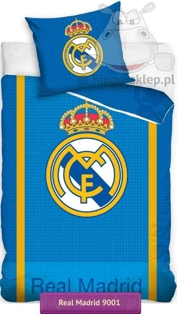 Pościel Realu Madryt jednego z najlepszych i najbardziej zasłużonych klubów piłkarskich w Europie i na świecie. Pościel z dużym herbem Realu Madryt na niebieskim tle z deseniem drobnej kratki oraz złotymi paskami po obu stronach pościeli i napisem Real Madrid w dolnej jej części na awersie i również w niebieskim kolorze z motywami herbu klubu na rewersie. Pościel dla kibica i fana hiszpańskiego klubu Królewskich z Madrytu o wymiarach 140x200 lub 160x200 cm jak również 135x200 lub 150x200 cm w zależności od wybranego wariantu rozmiaru i powłoczki o wymiarach 70x80, 50x80 lub 50x60 cm. Sportowa pościel kibica Realu Madryt zapinana na suwaki wykonana ze 100% bawełny gładkiej posiada certyfikat Oeko-Tex standard 100 gwarantujący wykonanie wyłącznie z bezpiecznych dla skóry surowców. Pościel wyprodukowana na licencji z oficjalnej klubowej kolekcji z hologramem potwierdzającym oryginalność produktu i metkami z logo klubu. Fantastyczny pomysł na upominek dla chłopca w każdym wieku którego pasjonuje football w wykonaniu drużyny z Madrytu. Producent piłkarska pościel licencyjna Carbotex, model Pościel Real Madryt RM 9001, ean 5902022948139 (140/200) 5902022948122 (160/200)
