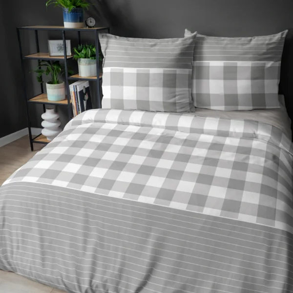 Szaro-biały komplet pościeli w kratkę i paseczki