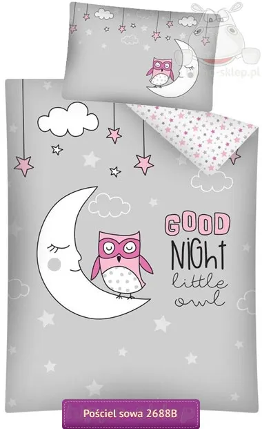 Mała pościel z różową sową do łóżeczka lub małych łóżek dziecięcych. Bawełniana pościel do łóżeczka w sowy z wizerunkiem śpiącej na księżycu różowej sówki. Pościel dla niemowlaków i maluchów w modnym blado-szarym kolorze z motywami chmurek i gwiazdek oraz napisem Dobranoc mała sówko "Good night little owl" i rewersem w kolorze białym w różowo szare gwiazdki. Komplet pościli do łóżeczek dla dziewczynek z różową sówką wykonana ze 100% bawełny z atestem Oeko-Tex 100 Tekstylia Godne Zaufania zapinana na suwaki. Pościel do łóżeczka różowa sowa 90x120, 90x130 lub 100x135 cm w zależności od wybranej opcji rozmiaru z jedną powłoczką na poduszkę 40x60 cm w komplecie. Pościel w sowy do łóżeczka doskonale sprawdzi się pokojach dziecięcych urządzonych w bladoróżowym kolorze pudrowego różu a także w kolorze białym. Producent pościel do łóżeczka Detexpol, model Mała pościel z różową sową 2688 B szara, ean 5901685628433
