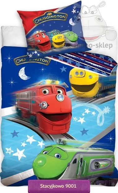 Pościel Stacyjkowo nocą komplet pościeli dziecięcej dla przedszkolaków i starszych dzieci uwielbiających przygody ciuchci ze Stacyjkowa - miasteczka pociągów: Wilsona, Koko i Brewstera. Oryginalna dziecięca pościel z pociągami na licencji o wymiarach 140x200 cm, 160x200 cm, 150x200 cm a także 135x200 cm w zależności od wybranej opcji i jednej powłoczki na poduszkę rozm. 70x80 cm, wykonana ze 100% bawełny gładkiej. Pościel Chuggington w niebiesko granatowej kolorystyce z postaciami ciuchci oraz motywami gwiazdek i księżyca, zapinana na suwaki, posiada certyfikat OEKO TEX standard 100 potwierdzający wykonanie z najwyższej jakości materiałów bezpiecznych dla skóry dzieci. Pościel z lokomotywami to świetny pomysł na upominek dla wielbicieli serialu o przygodach małych ciuchciaków.