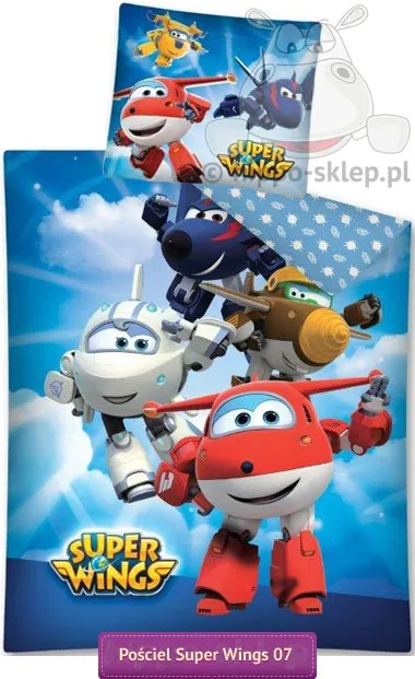 Dziecięca pościel z bohaterami animacji dla dzieci Super Wings - Dżetkiem, Lotkiem i Śrubkiem o samolotach mających zdolność przeobrażania się w roboty po to by dostarczyć na czas specjalne prezenty pomagające spełniać dziecięce marzenia. Kolorowa pościel dla dzieci z postaciami samolotów Super Wings na niebieskim tle wykonana ze 100% bawełny z jedną poszewką na poduszkę w komplecie. Bawełniana, dziecięca pościel Super Wings 140x200 lub 160x200 cm a także 150x200 i 135x200 cm w zależności od wybranego wariantu rozmiaru, z powłoczką o wymiarach 70x80 cm w komplecie, zapinana na suwaki. Pościel dziecięca Super Wings posiada certyfikat Oeko-Tex Standard 100 Tekstylia Godne Zaufania z materiałów bezpiecznych dla dzieci. Świetny pomysł na praktyczny upominek dla chłopców , uwielbiających serialowe przygody Drużyny samolotów Super Wings. Model SW 07 DX, ean 5901685627481 (140/200), 5901685620390 (160/200), producent pościeli Detexpol