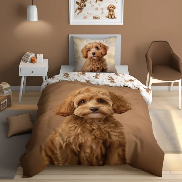 Komplet pościeli z wizerunkiem słodkiego szczeniaka pudla na poszwie na kołdrę i powłoczce na poduszkę, o biszkoptowo-brązowej sierści, czarnych wyrazistych oczach i zadartym nosku. Rewers poszwy na kołdrę w kolorze białym z drobnymi, jasno-brązowymi motywami skaczących piesków.