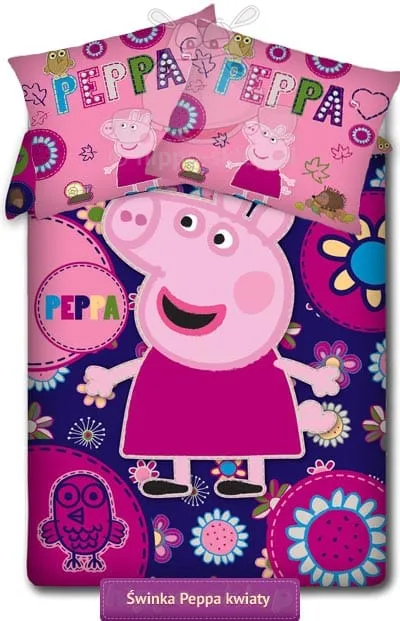 Pościel Świnka Peppa kwiatuszki 3 elem z bohaterką serialu animowanego (Peppa Pig) o przygodach wesołej rodzinki Świnki Peppy. Komplet pościeli Świnka Peppa dla dziewczynki w rozmiarze poszewki na kołdrę 140x200 cm lub 160x200 cm z dwiema poszewkami na poduszkę w rozmiarze 70x80 cm. Pościel 3 elementowa Świnka Peppa ze 100% bawełny, poszwa i poszewka zapinana na suwak, certyfikat Oeko-Tex standard 100 gwarantujący wysoką jakość surowców z jakich została wykonana i bezpieczeństwo dla skóry dziecka. Pościel 3 częściowa ze świnką Peppą to doskonały prezent dla dziewczynki wielbicielki małej świnki w czerwonej sukience. Producent pościeli Carbotex, model Pościel dla dzieci Świnka Peppa 2005 3 el.