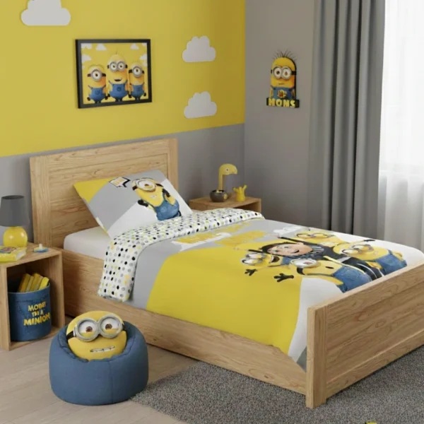 Szaro-żółty komplet pościeli Minionki Wejście Gru, 100% bawełna, Oeko-Tex 100, na suwaki, 140/200, 135/200, 120/160, 120/180, 140/160 i 140/180 cm