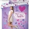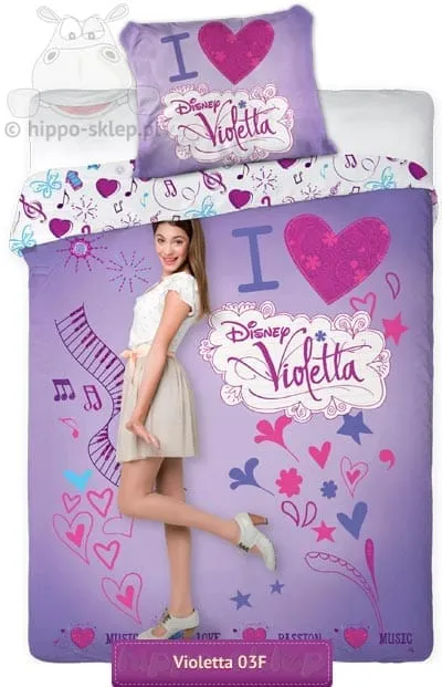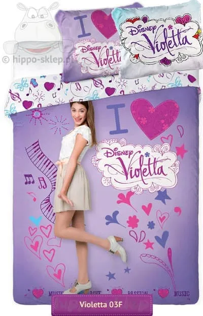 Pościel Violetta 03 z Tini Stoessel odgrywającą rolę tytułowej Violetty głównej postaci serialu znanego z Disney Channel o dziewczynie obdarzonej przepięknym głosem. Pościel z Violetty bawełniana (100%) dwuczęściowa z poszwą na kołdrę w rozmiarach 140x200 lub 160x200 a także 135x200 lub 150x200 cm w zależności od wybranego wariantu oraz jednej poduszki 70x80 cm. Pościel posiada certyfikat Oeko-tex standard 100 oznaczający wykonanie z materiałów bezpiecznych dla skóry. Świetny i praktyczny upominek dla fanki Tini Stoessel i serialu.