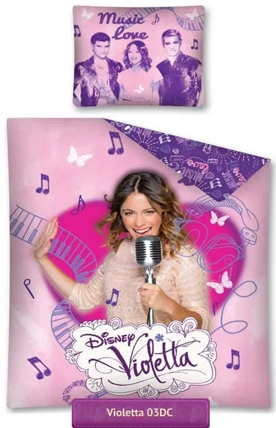 Pościel Violetta 03D licencyjny komplet dla nastolatki z wizerunkiem Violetty Martiny Stoessel w rozmiarze kołdry 140x200 cm 135x200, 150x200 cm lub 160x200 cm, 100% bawełna gładka o splocie satynowym. Pościel z Violettą bohaterka filmu wyświetlanego na kanale Disney Chanel o obdarzonej wyjątkowo pieknym głosem dziewczynie i jej przyjaciołach. Pościel Violetty dla nastolatki rozmiar poszwy na kołdrę 140x200 cm oraz 160x200 cm i poszewka na poduszkę 70x80 cm, zapięcie na zatrzaski, posiada certyfikat jakości OEKO-TEX 100 Tekstylia Godne Zaufania gwarantujący wykonanie z materiałów bezpiecznych dla skóry. Pościel z Violetty to świetny pomysł na praktyczny prezent dla każdej nastolatki.