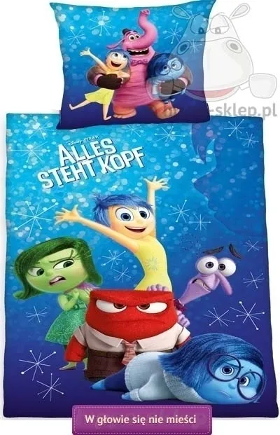 Pościel W głowie się nie mieści z bohaterami filmowej opowieści Disney Inside Out o jedenastoletniej dziewczynce o imieniu Rally oraz emocjami, które mają wpływ na jej uczucia. Bajkowa pościel z filmu W głowie się nie mieści, dla dziewczynki w kolorze błękitno niebieskim, z postaciami bohaterów-emocji, jakich doznaje Rally: radość, smutek, gniew, odraza i strach oraz słoniem Bing Bongiem na powłoczce. Pościel W głowie się nie mieści 140x200 cm lub 135x200 cm, a także 140x180 cm w komplecie z jedną dwustronną poszewką 70x80, 50x80 lub 50x60 cm o różnym nadrukiem po obu stronach. Pościel Inside out na licencji Disney Pixar, ze 100% gładkiej bawełny, zamykana na suwaki, posiada certyfikat Oeko-Tex standard 100 gwarantujący wytworzenie wyłącznie z bezpiecznych materiałów. Komplety pościeli z bohaterami Inside Out to fantastyczna propozycja dla dziewczynek, którym przypadła do gustu nagrodzona Oskarem wyjątkowa opowieść o tym, czym są emocje i jaki mają na nas wpływ. Producent pościel Herding, ean 4006891891181 (140/200) model Pościel w głowie się nie mieści Disney Inside Out. Najwyższa jakość w rewelacyjnej cenie. Zgarnij pościel Inside out w najlepszej cenie.