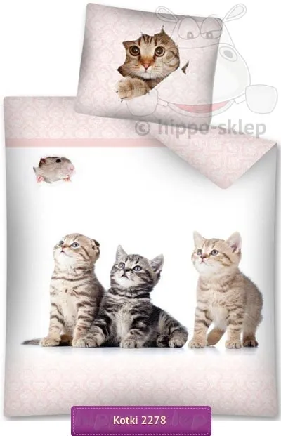 Pościel w koty z postaciami trzech kotów o różnym ubarwieniu sierści wpatrujących się w przedzierającą się mysz. Pościel w koty w kolorze białym z drobnymi jasno różowymi motywami u góry i na dole poszwy oraz na poszewce. Komplet pościeli w koty w rozmiarach 160x200 i 140x200 cm czyli w najbardziej popularnych w Polsce rozmiarach a także o wymiarach 135x200 lub 150x200 cm z jedną powłoczką w rozmiarze 70x80 cm. Komplet pościeli w koty wykonana ze 100% bawełny gładkiej zapinana na suwak to świetny pomysł na upominek dla wielbicieli tych domowych czworonogów. Producent pościel Detexpol, model Pościel dziecięca z kotami 2278A, ean 5901685614528 (140/200), 5901685614535 (160/200)