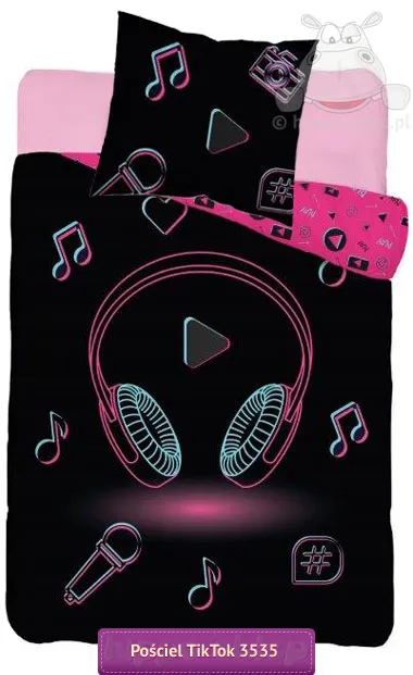 Bawełniana pościel w nutki dla dziewczynek i nastolatek. Komplet pościeli z motywem muzycznym oraz dużymi słuchawkami. Zestaw poszwa i poszewka dla dziewczynek z motywami symboli muzycznych w czarno-różowej kolorystyce z rewersem w kolorze różowym oraz drobnymi z ikonkami znanymi z internetu. Dwustronna powłoczka na poduszkę w kolorze czarnym z dużym przyciskiem "Play" pośrodku z tym samym deseniem na odwrocie. Nowoczesna młodzieżowa pościel w nutki i motywy związane z muzyką dla dziewczynek, dedykowana do pokoju nastolatki, urządzonym w czarno-różowych barwach lub ze zbliżonymi tematyczne dodatkami. Pościele w nutki i muzyczne symbole w rozmiarze 160x200 lub 140x200, a także 150x200 oraz 135x200 cm z jedną powłoczką na poduszkę w komplecie o wymiarach 70x80, 50x80 lub 50x60 cm, w zależności od wybranej opcji. Dostępne również komplety pościeli muzycznej dla młodszych dzieci 140x180 cm przeznaczone na łóżka pojedyncze 80x160 cm. Komplety muzycznej pościeli wykonane ze 100% bawełny certyfikowanej zgodnie z Oeko-Tex standard 100, powłoczki zamykane na zamki błyskawiczne. Wyjątkowo nowoczesny wzór oraz popularny i uniwersalny motyw muzyczny to fantastyczny pomysł na praktyczny upominek dla dziewczynek kochających muzykę niezależnie od jej rodzaju. Producent pościeli muzycznej Detexpol, model Pościel z nutkami i motywami muzycznymi 3535, ean 5901685666367 (160/200), 5901685666374 (140/200)
