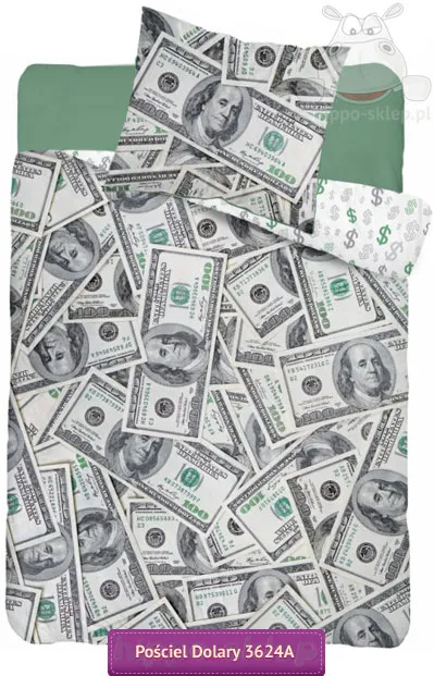 Pościele młodzieżowe z motywem banknotów 100 dolarowych z wizerunkiem Benjamina Franklina. Pieniądze, potocznie forsa, gotówka, kapucha, kasa, sałata, siano, lub szmal to jeden z nielicznych motywów, które kapitalnie nadają się na wszelkiego rodzaju gadżety. Fantastyczna pościel i genialny pomysł na upominek dla starszych nastolatków i młodzieży. Pomysłowy gadżet i jajcarski prezent dla nastolatków z okazji osiemnastych urodzin oraz dla dorosłych singli na nowe mieszkanie, parapetówkę. Po jej otrzymaniu obdarowany będzie mógł zgodnie z prawdą stwierdzić, że śpi na pieniądzach 🙂 Bawełniana pościel z nadrukowanymi banknotami 100-dolarowymi na awersie oraz po obu stronach powłoczki na poduszkę. Rewers pościeli z szarymi oraz zielonymi symbolami dolara. Pościel z motywem dolarów amerykańskich w rozmiarach tradycyjnych 160x200 lub 140x200 cm, w rozmiarze Ikea 150x200 cm oraz w rozmiarze niemieckim 135x200 cm z jedną poszewką na poduszkę 50x60, 50x80 lub 70x80 cm w komplecie. Pościele z nadrukiem banknotów wykonane ze 100% bawełny gładkiej, poszwa na kołdrę i poszewka na poduszkę zapinana na zamki, pościel certyfikowana zgodnie z Oeko-Tex standard 100 Tekstylia godne zaufania. Producent: Detexpol, model Młodzieżowa pościel z pieniędzmi, w dolary 3624A, ean 5901685670081 (140/200) 5901685670074 (160/200)