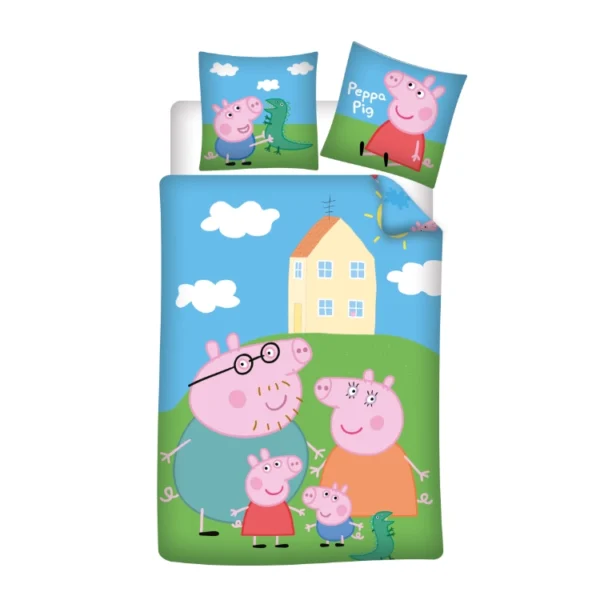 Niebiesko-zielona pościel z postaciami Świnki Peppy, Mamy i Taty Świnki oraz Jacka, PP-210, 100% bawełna, Oeko-Tex 100, na suwaki, rozmiary 100x135, 90x130 lub 90x120 cm