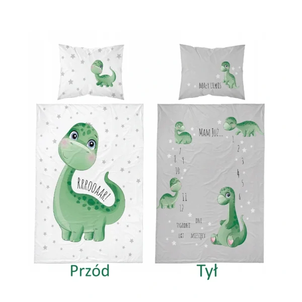 Mała pościel z dinozaurem dla niemowlaka do łóżeczka dziecięcego. Bawełniana pościel dla chłopca lub dziewczynki z wizerunkiem malutkiego i młodego zielonego dinozaura i napisem Rrrooaar! Dwustronna, zielono-szara pościel dla niemowlaków, z zielonym dinozaurem na białym tle w szare gwiazdki na awersie oraz szarym rewersem w białe gwiazdki z metryczką pozwalającą na fotograficzne dokumentowanie kolejnych miesięcy i lat malucha. Komplet pościeli do małego łóżka dziecięcego z powłoczką na poduszkę i poszwą na kołderkę wyprodukowaną ze 100% bawełny gładkiej, certyfikowana według Oeko-Tex standard 100, z atestem IMiD w Łodzi, powłoczki zapinane na suwaki. Biało-szara pościel z dinozaurem dla starszych niemowlaków i młodszych dzieci przedszkolnych dostępna w rozmiarach poszwy 80x120, 90x120, 90x130 oraz 100x135 cm w zależności od wybranej opcji rozmiaru z małą powłoczką 40x40 lub 40x60 cm w komplecie. Pościel niemowlęca z dinozaurem będzie świetnie uzupełniać pokój lub sypialnię dziecka urządzoną w szarej, lub białej kolorystyce. Producent pościele Detexpol, model Pościel dla niemowlaka z dinozaurem 3317A, ean 5901685669467 (100/135)