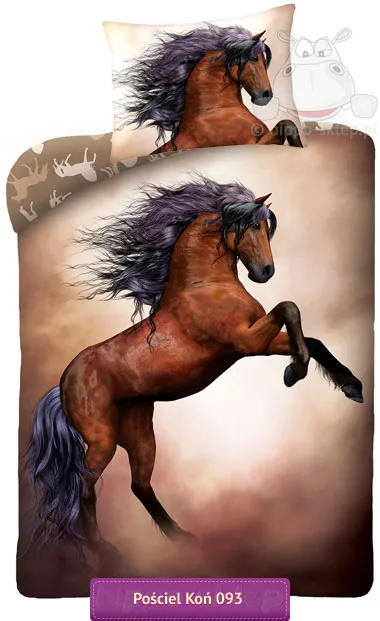 Pościel z dzikim koniem - Mustangiem dla młodszych i starszych miłośników jeździectwa oraz pięknych koni. Niezwykły komplet pościeli z przepiękną dziką klaczą Mustanga maści kasztanowatej o bujnej czarno-fioletowej grzywie. Bawełniana pościel z koniem w odcieniach ciemnego brązu i beżu sprawdzą się w każdej sypialni wielbiciela jeździectwa o wnętrzu w zbliżonej brązowej kolorystyce. Pościele z dzikim koniem 140x200 lub 135x200 z jedną powłoczką 70x80 cm w komplecie, ze 100 % bawełny gładkiej z atestem Oeko-Tex 100 Tekstylia godne zaufania, zapinana na suwak. Pościele z dzikim Mustangiem to wymarzony prezent dla każdego fana koni i jeździectwa niezależnie od wieku. Producent Halantex, model Pościel z koniem Mustang H-007 0093BL, ean 5902729041843