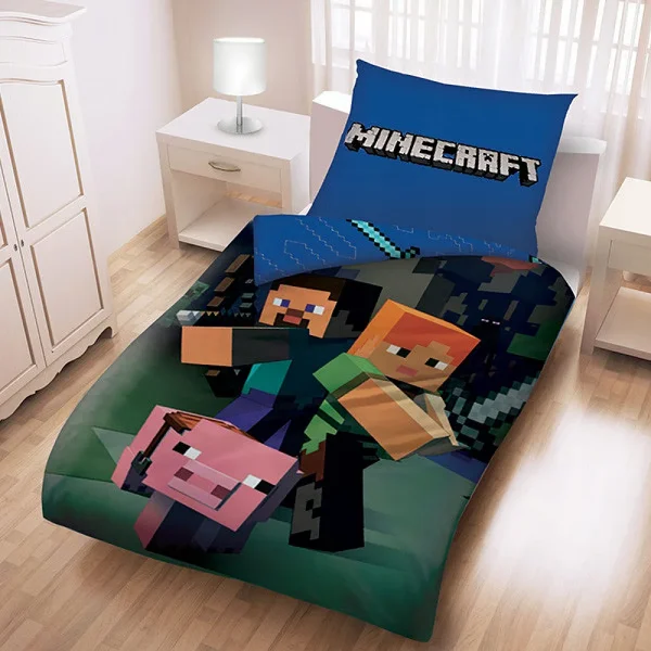 Pościel z gry Minecraft w niebieskiej kolorystyce przedstawiająca postacie występujące w grze. Pościel Minecraft Steve Alex i Baby Pig, a także rywalami graczy Creeper, Enderman i nietoperze. Pościel z gry Minecraft dla chłopca w zielono niebieskiej kolorystyce z charakterystycznym napisem 3D Minecraft na poduszce w niebieskim kolorze. Komplet pościeli Minecraft z rewersem w kolorze niebieskim z kilofami. Pościel w Minecraft dostępne również w rozmiarach 140x200, 135x200, 150x200 oraz 160x200 w zależności od wybranej opcji rozmiaru z poszewką 70x80 lub 50x80 cm. W ofercie dostępna również opcja pościeli z gry Minecraft z dwiema poszewkami 160x200 + 2x 70x80 Pościele z gry Minecraft Alex Steve and Baby Pig wykonane ze 100% bawełny, zapinana na suwaki, certyfikowana według Oeko-Tex standard 100 - Tekstylia godne zaufania. Pościel z motywem Minecraft dla dzieci, na licencji Mojang, producent pościel Character World, model Pościel Alex Steve i Baby Pig MNC 020 BL, ean 5902729040068 (140/200), 5902729041645 (160/200) Fantastyczny pomysł na upominek dla fanów gry.