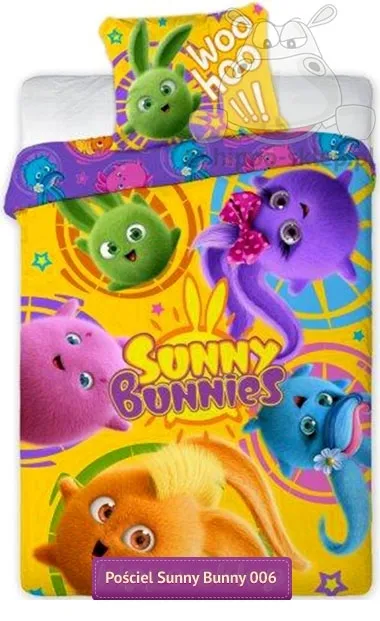 Pościel dla maluchów z króliczkami Sunny Bunnies uwielbiającymi zabawę, psoty i działanie w zespole bohaterami animowanej serii dla najmłodszych Sunny Bunnies. Mała pościel dziecięca z króliczkami Sunny Bunnies Różowym - Big Boo, fioletowym - Iris, Pomarańczowym - Turbo, niebieskim Shiny i zielonym - Hopper w żółtej kolorystyce z dużym napisem "Sunny Bunnies" po środku. Rewers pościeli w kolorze fioletowym z małymi postaciami bohaterów, poszewka z postacią zielonego króliczka Hoppera i napisem "Woo hoo". Bawełniana pościel Sunny Bunny 90x120, 90x130 lub 100x135 cm w zależności od wybranej wielkości z jedną powłoczką 40x60 cm w komplecie. Pościel z kolorowymi króliczkami do małych łóżek dziecięcych, przeznaczona dla dziewczynek, wyprodukowana z gładkiej 100% bawełny z atestem Oeko-Tex standard 100, z bezpiecznych dla dzieci surowców. Żywa słoneczna kolorystyka pościeli z Sunny Bunnies nawiązująca bogactwem kolorów do kolorystyki postaci. Producent pościeli Faro, model Mała pościel dziecięca Sunny Bunnies 006, ean 5907750555406