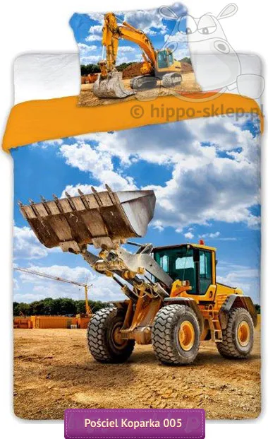 Pościel z dużą ładowarką, jedną z wielu maszyn budowlanych obok samochodu najfajniejszą zabawką dla chłopca. Bawełniany komplet pościeli z dużą, żółtą ładowarką łyżkową, wyposażoną w szeroką łyżkę do załadunku i transportu sypkich materiałów budowlanych. Pościele z ładowarką kołową dla chłopców w żółto niebieskiej kolorystyce, poszwa na poszewkę z dużą ładowarką w trakcie prac ziemnych na placu budowy na tle błękitnego nieba, rewers pościeli w jednolitym żółtym kolorze. Dwustronna powłoczka na poduszkę z łyżkową koparką gąsienicową o napędzie hydraulicznym w kolorze żółtym po obu stronach. Pościel z ładowarką 160x200 cm lub 150x200 cm, a także 140x200 lub 135x200 z jedną powłoczką na poduszkę 70x80, lub 50x80 cm w komplecie. Dostępna również pościele na wymiar 120x160, 140x180 140x160 cm na mniejsze łóżka 80x160 cm. Pościel Turbo 005 z nadrukiem ładowarki, wykonana ze 100% bawełny, posiada certyfikat Oeko-Tex standard 100 gwarantujący wykonanie z przebadanych i bezpiecznych materiałów, poszewka i poszwa zapinane na suwaki kryte. Jeśli twoje dziecko uwielbia zabawy maszynami budowlanymi oraz jest fanem dużych maszyn budowlanych, właśnie to nakrycie łóżka ucieszy go najbardziej. Pościel z dużą ładowarką świetnie sprawdzi się jako dodatek w sypialniach dziecięcych i pokojach tematycznych urządzonych w tylu placu budowy lub maszyn budowlanych w żółtej, lub szaro żółtej kolorystyce. Producent pościeli Detexpol, model Pościel z koparko-ładowarką Turbo 005, ean 5907750582488 (140/200) 5907750582549 (160/200)