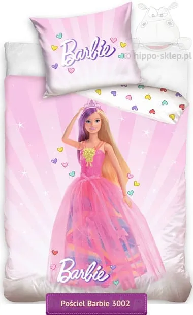 Pościel z Barbie dla dziewczynki z postacią lalki wzorowanej na głównej bohaterce popularnego serialu odcinkowego dla dziewczynek Barbie - Dom marzeń (Life in the Dreamhouse) publikowanego na stronie Mattel oraz kanale Youtube. Serial opowiada o przygodach Barbi jej sióstr Skipper, Stacie i Chelsea, Kena, przyjaciół i zwierzątek zamieszkujących w wymarzonym domku w Malibu. Bladoróżowa pościel z dużą lalką Barbie w różowej sukience z tiulu na poszwie oraz napisem Barbie na poszewce z drobnymi kolorowymi serduszkami. Rewers pościeli w jednolitym kolorze białym z motywem kolorowych serduszek. Pościel z lalką Barbie 160x200, 140x200 a także 135x200 lub 150x200 cm w zależności od wybranej opcji rozmiaru kołderki z jedną poszewką na poduszkę o wymiarach 70x80, 50x80 lub 50x60 cm. Pościel Barbie na licencji Mattel, wykonana z gładkiej bawełny 100%, posiada certyfikat Tekstylia godne zaufania Oeko-Tex standard 100 gwarantujący wykonanie z materiałów bezpiecznych dla dzieci. Powłoczki na poduszkę i kołdrę z Barbie zapinane na suwaki. Producent Carbotex, model Pościel dziecięca z laką Barbie BARB213002, ean 5904302509931 (140/200), 5904302509948 (160/200)