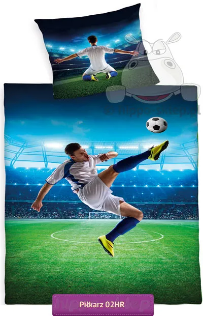 Pościel z piłkarzem w rozmiarze 140x200 cm przedstawiająca piłkarza oddającego strzał "przewrotką". Pościel młodzieżowa dla fanów piłki nożnej w kolorystyce niebiesko-zielonej, przedstawiającej stadion piłkarski z piłkarzem strzelającym przewrotką oraz ujęcie piłkarza cieszącego się po zdobyciu bramki na poszewce na poduszkę. Pościel nastolatków z piłkarzem o wymiarach 140x200 cm lub 135x200 cm w zależności od wybranego rozmiaru, z poszewką na poduszkę 70x80 cm zapinana na suwaki. Wykonana ze 100% bawełny, posiada certyfikat Oeko-Tex standard 100 gwarantujący, iż do jej produkcji zostały użyte wyłącznie bezpieczne surowce. Pościel z piłkarzem oddającym efektowny strzał dla wszystkich małych i dużych piłkarzy i fanów footballu będzie zawsze atrakcyjnym pomysłem na upominek bez względu na piłkarskie preferencje. Producent Pościel Herding, model Pościel piłkarska Soccer 4459212 077, ean 4006891908605