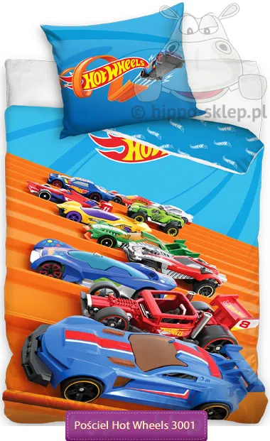 Pościel Hot Wheels z samochodami wyścigowymi "resorakami" i replikami najsłynniejszych modeli samochodów osobowych wykreowanych przez firmę Mattel. Bawełniane pościele z Hot Wheels dla chłopców, w niebieskiej kolorystyce z modelami samochodów na pomarańczowym wielotorowym torze wyścigowym - jednej z najciekawszych zabawek dla chłopców. Pościel z resorakami Hot Wheels o wymiarach 160x200 cm, 140x200 cm, 150x200 cm lub 135x200 cm a także rozmiary niestandardowe 140x160 lub 140x180 w zależności od wybranego wariantu i jedną powłoczką o wymiarach 70x80 cm lub 50x80 cm w komplecie. Pościel z wyścigówkami wyprodukowana na licencji Mattel ze 100% bawełny, posiada certyfikat Oeko-Tex 100 gwarantujący wykonanie z bezpiecznych dla dzieci surowców. Pościel z samochodami Hot Wheels dla prawdziwego fana resoraków, torów wyścigowych, i zestawów samochodowych. Producent Carbotex, model Pościel z samochodami Hot Wheels 203001, ean 5902689448843