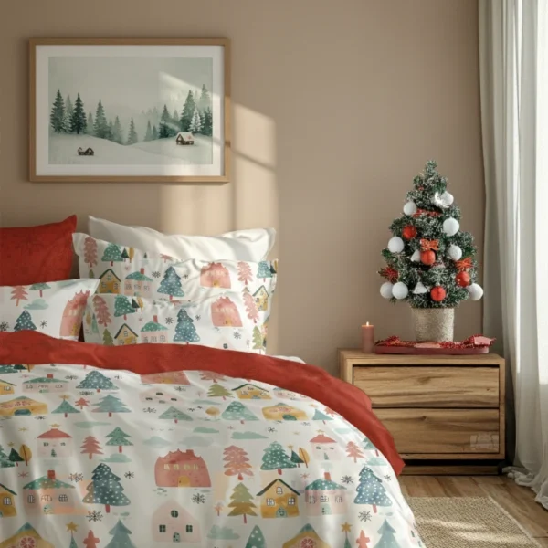 Kolorowe komplety pościeli z motywem domków choinek i płatków śniegu w świątecznej, zimowej aranżacji.