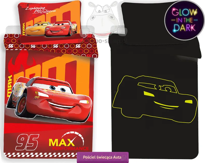 Bawełniana pościel świecąca w ciemności z Zygzakiem McQueenem dla chłopców. Komplet pościeli z postacią czerwonego samochodu Zygzaka - bohatera serii filmów Disney Cars z elementami świecącymi w ciemności po wcześniejszej ekspozycji na światło. Elementy oddające światło w postaci obrysu samochodu z oczami, reflektorami oraz uśmiechniętą buzią są zaznaczone w kolorze żółtym na ciemniejszym zdjęciu pościeli. Poszewka na poduszce z wizerunkiem Zygzaka oraz Cruz Ramirez, rewers pościeli w kolorze czerwonym. Pościel świecąca w ciemności z Zygzakiem McQueenem 140x200, 135x200, 140x180, 140x160 oraz 120x160 z jedną powłoczką na poduszkę 70x80 lub 50x80 cm. Poszwa na kołdrę i poszewka na poduszkę z postacią Zygzaka McQueena wykonane na licencji Disney Cars, ze 100% bawełny, certyfikowanej zgodnie z Oeko-Tex standard 100 tekstylia godne zaufania, zapinane na suwak. Efektowny komplet pościeli świecącej dla dzieci w wieku przedszkolnym to genialny pomysł na upominek dla fanów filmu Disney-a. Świecąca w ciemności pościel z McQueenem doskonale uzupełni wnętrze pokoju dziecięcego w białej lub szarej kolorystyce z dodatkami w kolorze czerwonym. Producent pościel świecąca Jerry Fabrics, model Pościel z Zygzakiem McQueenem świecąca 18BS398