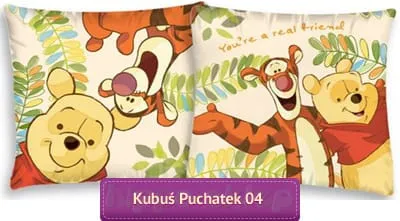 Poszewka Kubuś Puchatek 08 powłoczka / jaś na poduszkę, o wymiarach 40x40 cm z postaciami Kubusia Puchatka i Tygryska z filmów wytwórni Disney-a. W zależności od wybranej opcji poszewki dziecięce występują w dwóch wersjach jako samodzielne powłoczki lub jako zestaw powłoczka z wypełnieniem / wkładem antyalergicznym. Poszewki z Puchatkiem 40x40 cm wykonane ze 100% bawełny, zapinane na suwak mogą uzupełniać komplety pościeli z kolekcji z Kubusiem lub Tygryskiem. Oryginalna poszewka na licencji Disney Winnie The Pooh wykonana zgodnie z Oeko-Tex 100 standard 100 zapewniającej wysoką jakość materiałów, intensywne kolory i trwałość nadruku przez długi czas. Producent poszewki Detexpol, model Mała poszewka Kubuś Puchatek WTP 04, ean 2345678000821