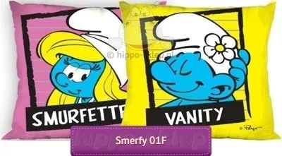 Poszewka dziecięca ze Smerfetką i Lalusiem - powłoczka na poduszki lub poduszka dekoracyjna w zależności od wybranej opcji rozmiaru z wizerunkiem Smerfetki - jedynej dziewczyny w wiosce smerfów oraz Lalusia zakochanego w sobie narcyza chodzącego wszędzie z lusterkiem. Dwustronne poszewki dla dzieci i dziecięce poduszki dekoracyjne ze Smerfami o wymiarach 40x40 cm w kolorystyce różowo żółtej kolorystyce ze Smerfetką na różowym oraz Lalusiem na żółtym tle. Poszewka dziecięca ze smerfami wykonana ze 100% bawełny gładkiej, w przypadku poduszki dekoracyjnej - wypełnienie poduszki (wkład) z kolekcji Sensidream, poszycie z mikrofazy, wypełnienie włókna Hollow. Zarówno poszewka jak i poduszka posiada certyfikat Oeko Tex standard 100 - Tekstylia Godne Zaufania. Producent poszewki Faro, model Mała poszewka dziecięca Smerfy 01, ean 2345678000890