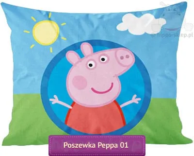 Duża poszewka na poduszkę ze Świnką Peppą. Bawełniana powłoczka na dużą poduszkę z motywem postaci Peppy - najpopularniejszej świnki z bajek dla najmłodszych. Zielono-niebieska poszewka na poduszkę z uśmiechniętą buzią świnki ze słoneczkiem i chmurką w tle. Bawełniane powłoczki ze Świnką Peppą o wymiarach 70x80, 50x80 lub 50x60 cm w zależności od wybranej opcji rozmiaru, wykonane ze 100% bawełny, z tym samym nadrukiem postaci po obu stronach, zapinane na suwak. Dziecięce poszewki Peppa Pig wykonane na licencji z certyfikatem Oeko-Tex standard 100 gwarantujący wykonanie z materiałów bezpiecznych dla skóry dziecka. Powłoki ze Świnką Peppa, mogą być uzupełnieniem każdego zestawu pościelowego z tej samej kolekcji. Model Duża powłoczka na poduszkę Świnka Peppa 01