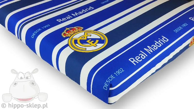 Prześcieradło Real Madryt dla chłopca. Bawełniane prześcieradła Real Madryt w błękitne oraz białe poziome pasy z motywami herbu drużyny. Prześcieradła Realu Madrid płaskie przeznaczone do kompletów pościeli z motywami klubu sportowego Real Madrid FC ze stolicy Hiszpanii. Niebiesko - białe prześcieradła z logo klubu Królewskich i napisem Real Madrid o wymiarach 140x200, 150x210 lub 155x235 cm (+/- 3%) w zależności od wybranego wariantu rozmiaru, płaskie, bez gumki, jednorodne, ze 100% bawełny. Prześcieradła Realu Madryt doskonale dopasowane do pościeli klubowej białej lub błękitno - niebieskiej kolorystyce, przeznaczone na łóżka z materacem o wielkości w zakresie od 80x160 do 160x200 cm. Model Prześcieradło Real Madryt 006