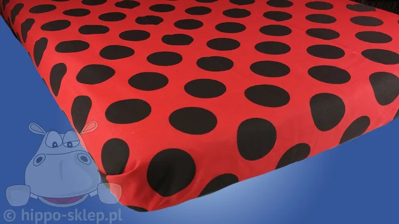 Czerwone prześcieradło w czarne kropki do kompletów pościeli z kolekcji Biedronka i Czarny Kot Miraculum. Prześcieradło dziecięce w kolorze czerwonym w duże czarne kropki. Jednorodne bawełniane prześcieradło dziecięce Miraculum, bez gumki, o wymiarach 140x200 cm (+/- 3 %), przeznaczone na jednoosobowe łóżka dziecięce o rozmiarze materaca od 80x160 do 140x200 cm, wyprodukowane ze 100 % bawełny gładkiej. Prześcieradła dla dzieci dopasowane kolorystycznie do kompletów pościeli z serialową Biedronką z odcinkowej animacji dla dzieci Disney-a. Model Prześcieradło dziecięce czerwone w czarne grochy, ean 2345678001965