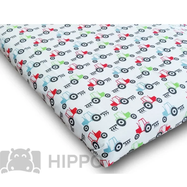 Bawełniane prześcieradło z drobnym motywem kolorowych traktorów. Prześcieradła z motywem rolniczym z kolekcji Farmer w kolorze białym z nadrukami kolorowych zielonych, niebieskich oraz czerwonych traktorów. Prześcieradło z motywami rolniczymi doskonale pasuje do wszystkich kompletów pościeli z motywem ciągników i maszyn rolniczych, traktorów czy kombajnu. Bawełniane prześcieradło z motywem rolniczym 140x200 cm (+/- 3%) bez gumki, ze 100% bawełny gładkiej, jednorodne, dla chłopca. Prześcieradła z kolekcji Farmer, przeznaczone na materac łóżka dziecięcego o wymiarach od 80x160 cm do 140x200 cm w zależności od sposobu rozkładania. Model Prześcieradło z motywem rolniczym PR-2639.