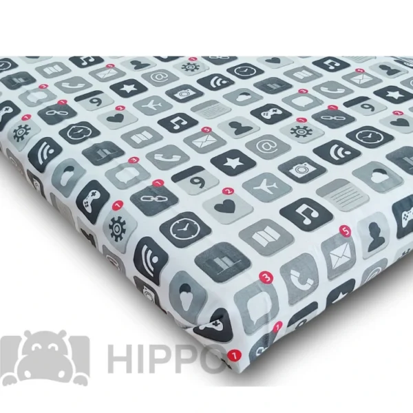 Bawełniane prześcieradło z motywem ikonek aplikacji znanych ze smartfonów i tabletów. Jednorodne, szare prześcieradło z ikonkami aplikacji, płaskie, bez gumki, o wymiarach 140x200 cm (+/- 3 %), przeznaczone na materace łóżek jednoosobowych o wymiarach od 80x160 cm do 140x200 cm w zależności od sposobu rozkładania. Prześcieradła w kolorze szarym z ikonkami, wyprodukowane ze 100 % bawełny gładkiej z atestem Oeko-Tex 100, starannie obszyte, to świetne uzupełnienie kompletów pościeli z tabletami i telefonami. Model Prześcieradło dziecięce z motywem ikonek aplikacji smartfonów PR-3038