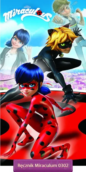 Ręcznik Biedronka i Czarny kot - Miraculum dla dziewczynki. Bawełniany ręcznik plażowy i kąpielowy z postaciami nastolatki Marinette wcielającą się w postać serialowej Biedronki oraz Adriena chłopca przybierającego postać Czarnego kota. Plażowy ręcznik z Biedronką i Czarnym kot-em serialowymi paryskimi superbohaterami chroniącymi metropolię przed niecnymi planami Władcy Ciem. Duży ręcznik plażowy Biedronka i Czarny kot w błękitno czerwonej kolorystyce z bohaterami na tle dużej czerwonej tarczy w czarne kropki oraz zabudowań Paryża. Ręcznik Miraculum Biedronka i Czarny kot 70x140 cm, wykonany ze 100% bawełny o splocie pętelkowymi (frote) i jednostronnym wykończeniu welurowym z kolorowym nadrukiem postaci. Ręczniki z Biedronką i Czarnym kotem są niezastąpione na plaży, basenie i w parku wodnym, oprócz funkcji ręcznika plażowego świetnie sprawdzają się po kąpieli w domu jako ręczniki kąpielowe. Ręcznik licencyjny z Biedronką i Czarnym kotem z oficjalnej kolekcji na licencji Zagtoon / Disney. Producent Character World, model Ręcznik Biedronka i Czarny kot MI-0302T, ean 5902729044561