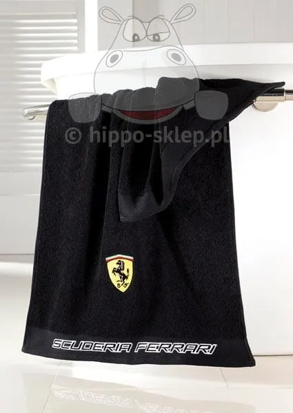 Ręcznik Ferrari czarny klasyczny ręcznik frote w kolorze czarnym z haftowanym logo Ferrari dla każdego kibica i fana Formuły 1 i zespołu Ferrari Scuderia. Oryginalne ręczniki frote z haftem wykonane na licencji Ferrari Scuderia Spa, 100% bawełna, rozmiar 50x100 cm. Klasyczne ekskluzywne ręczniki frote są miłe w dotyku, nie farbują i zachowują trwałość po wielokrotnym praniu. Świetny pomysł na praktyczny prezent dla kibiców i fanów wyścigów formuły 1 oraz teamu Ferrari Scuderia. Producent Global Labels, model G10300F40150, czarny