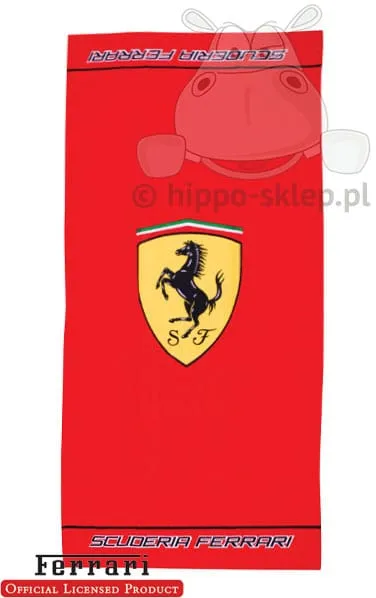 Ręcznik Ferrari czerwony logo kąpielowy lub plażowy klasyczny ręcznik z logo z oficjalnej kolekcji dla fanów sportowych samochodów i teamu Formuły 1 Ferrari Scuderia. Wykonany na licencji bawełniany ręcznik o splocie frote (100% bawełna) i wykończeniu welurowym o wymiarach 75x150 cm w kolorze czerwony-ferrari z logo teamu. Ręcznik Ferrari czerwony logo wykonany zgodnie z wytycznymi standardu tekstylia godne zaufania Oeko-Tex standard 100 wyłącznie z przebadanych i bezpiecznych dla skóry surowców. Elegancki i praktyczny pomysł na upominek dla wielbicieli wyścigów i temu formuły 1. Producent Global Labels, model G10400F33100