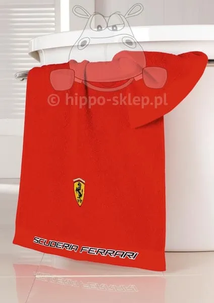 Ręcznik Ferrari czerwony klasyczny ręcznik frotte w kolorze czerwonym z haftowanym logo Ferrari dla każdego kibica i fana Formuły 1 i zespołu Ferrari Scuderia. Oryginalne ręczniki frotte z haftem wykonane na licencji Ferrari Scuderia Spa, 100% bawełna, rozmiar 50x100 cm. Klasyczne ekskluzywne ręczniki frotte są miłe w dotyku, nie farbują i zachowują trwałość po wielokrotnym praniu. Świetny pomysł na praktyczny prezent dla kibiców i fanów wyścigów formuły 1 oraz teamu Ferrari Scuderia. Producent Global Labels, Model G10300F40110 czerwony