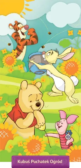 Ręcznik Kubuś Puchatek 06 plażowy ręcznik kąpielowy dla dzieci - wielbicieli Kubusia Puchatka i ferajny. Bawełniany ręcznik dla dzieci z Postaciami Kubusia Puchatka, Tygryska, Prosiaczka oraz Króliczka zbierających nektar na łące w żółto zielonej kolorystyce. Niezastąpiony na plaży, basenie i po kąpieli oryginalny ręcznik Kubuś Puchatek na licencji Disney Winnie The Pooh. Ręcznik plażowy Kubuś Puchatek 70x140 cm, ze 100% bawełny, z jednostronnym wykończeniem welurowym z nadrukiem. Ręczniki z Puchatkiem są przyjemne w dotyku, kolory nie farbują i zachowują trwałość nawet po wielokrotnym praniu. Super pomysł na praktyczny upominek dla każdego malucha. Producent Faro, model Ręcznik dziecięcy Kubuś Puchatek 06.