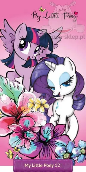 Ręcznik My Little Pony z postaciami Twilight Sparkle oraz Rarity - przyjaciółek z miasta kucyków Ponyville. Ręcznik plażowy z kucykami pony w różowej kolorystyce, różnokolorowym motywem kwiatów i motylków oraz napisem "My Little Pony". Praktyczny ręcznik dla każdej małej fanki serialu z Kucykami Pony, niezbędny na plaży, basenie i po kąpieli a także w domu. Oryginalne ręczniki dla dzieci na licencji Hasbro z jednostronnym wykończeniem welurowym z nadrukiem, 100% bawełna.