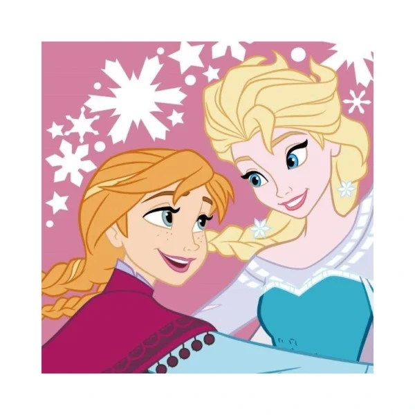 Magiczny ręczniczek z postaciami z filmu Kraina Lodu Disneya, w różowo-fioletowej kolorystyce dla młodszych dziewczynek zafascynowanych baśniowymi przygodami bohaterek.