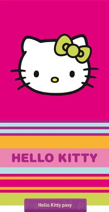 Ręcznik plażowy Hello Kitty - bardzo duży ręcznik z wizerunkiem kotki Hello Kitty dobrze znaną postacią małej kotki Kitty White z japońskiego serialu animowanego o przygodach rodziny kotki Kitty i jej siostry bliźniaczki Mimmy. Duże ręczniki plażowe z wizerunkiem buźki Hello Kitty w kolorowe różowo - pomarańczowo - fioletowo - zielono - niebieskie pasy. Plażowy ręcznik z Hello Kitty o wymiarach 85x160 cm, wykonany ze 100% bawełny (splot frotte) o wykończeniu welurowym z jednostronnym nadrukiem. Ręcznik w kolorze Ręcznik wyprodukowany na licencji japońskiej firmy Sanrio ze względu na swoją wielkość idealnie sprawdzi się nad woda i na plaży a także może pełnić rolę dużego ręcznika kąpielowego. Producent ręczników CTI, model Hello Kitty Kim 42335, kod ean 3272760423352