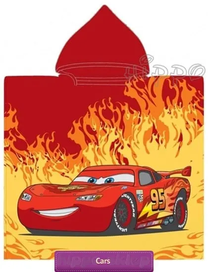 Ręcznik z kapturem Auta 02 praktyczne poncho plażowe dla dzieci. Duży ręcznik w stylu ponczo dla chłopca fana Zygzaka McQueen-a z serii filmów animowanych Disney-a. Ręcznik ponczo z McQueenem wykonane na licencji Disney Cars z jednostronnym nadrukiem w czerwono żółtej pomarańczowej kolorystyce i dużą postacią samochodu. Dziecięcy ręcznik z kapturem Auta 120x60 cm (po rozłożeniu) dla chłopców o wykończeniu welurowym z kolorowym nadrukiem bohatera filmu Auta Disney Cars, spód o tradycyjnym splocie frote. Ręcznik z Kapturem Auta niezastąpiony podczas zabaw na plaży i zewnętrznym basenie, pozwala na szybkie osuszenie malucha a ulubione autko odwraca uwagę dziecka w trakcie nieprzyjemnego wycierania. Funkcjonalny kaptur zapobiega zrzuceniu poncza. Duże poncza kąpielowe Auta przeznaczone dla dzieci od 2 do 6 roku życia są solidnie wykonane i miłe w dotyku, kolory nie farbują i nie płowieją po praniu. Producent ręczniki Faro, model Ręcznik ponczo z kapturem Cars 02