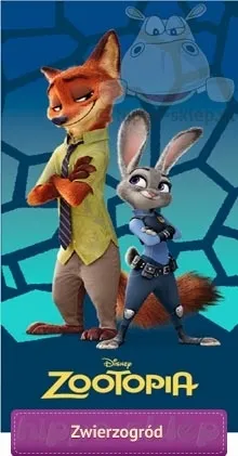 Ręcznik Zwierzogród z bohaterami filmu animowanego Disney Zootopia (Zootropolis) opowiadającego historię podejmującej pracę w Policji w stolicy zwierzęcego świata niedoświadczonej Judy Hopps oraz informatora Nicka Bajera. Ręcznik z filmu Zwierzogród z dużymi postaciami głównych bohaterów (królika i lisa) wykonany ze 100% bawełny z jednostronnym wykończeniem welurowym i nadrukiem. Ręcznik z oficjalnej filmowej kolekcji Disney-a o wymiarach 70x120 cm, wyprodukowany na licencji może być świetnym upominkiem dla fanów tej filmowej opowieści. Producent ręczniki CTI, model Ręcznik dla dzieci Zwierzogród Zootopia Malice, ean 3272760434518