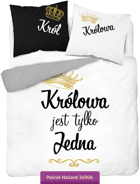 Śmieszna pościel z napisami. Bawełniana pościel dla par z napisami "Królowa jest tylko jedna" na poszwie w kolorze białym oraz Król na poszewce w kolorze czarnym, oraz królowa na powłoczce w kolorze białym. Czarno-biały komplet pościeli dla dwojga w humorystyczny sposób nawiązujący do dominacji tej jedynej "Królowej" przeznaczony dla osób z poczuciem humoru. Pościel dla par Królowa jest tylko jedna przeznaczona na duże łóżka podwójne o wymiarach poszwy na kołdrę 200x220, 200x200 lub 180x200 cm w zależności od wybranej wielkości z dwiema poszewkami na poduszkę 70x80, lub 50x60 cm w komplecie. Dostępna także pościel z napisami na średnie łóżka dwuosobowe o wymiarach poszwy 160x200 lub 150x200 cm z powłoczkami 50/60, lub 70/80 cm. Pościele ze śmiesznymi napisami z kolekcji Holland wykonane z tkaniny ze 100% bawełny, certyfikowana według Oeko-Tex Standard 100 Tekstylia godne zaufania, poszwa i poszewki zapinane na suwaki. Pościel z napisami dla dwojga to genialny pomysł na upominek bez względu na okazję dla osób o wyjątkowym poczuciu humoru z dużym dystansem do siebie. Doskonały prezent na przeprosiny dla każdego Pana. Klasyczna czarno-biała kolorystyka zastawu z drobnymi złotymi elementami w postaci korony króla i królowej na poszwie i poszewkach to gwarancja dopasowania do niemal każdego wystroju sypialni. Producent Detexpol, model Pościel z napisami Królowa jest tylko jedna 3600A, ean 5901685669306 (160/200), 5901685669313 (200/220)